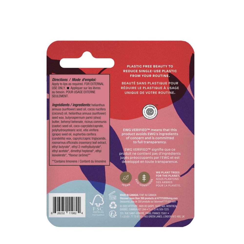 Balm away the dryness and leave lips blissfully buttery with ATTITUDE Lip Balm – Watermelon. Featuring a refreshing watermelon aroma and a combo of nourishing agents like shea butter, grapeseed, coconut and castor oils, for silky smooth lips! Plastic-free, EWG VERIFIED™ and vegan, this biodegradable solid lip balm is perfect to carry on-the-go and a great way to care for your lips while caring for the environment.