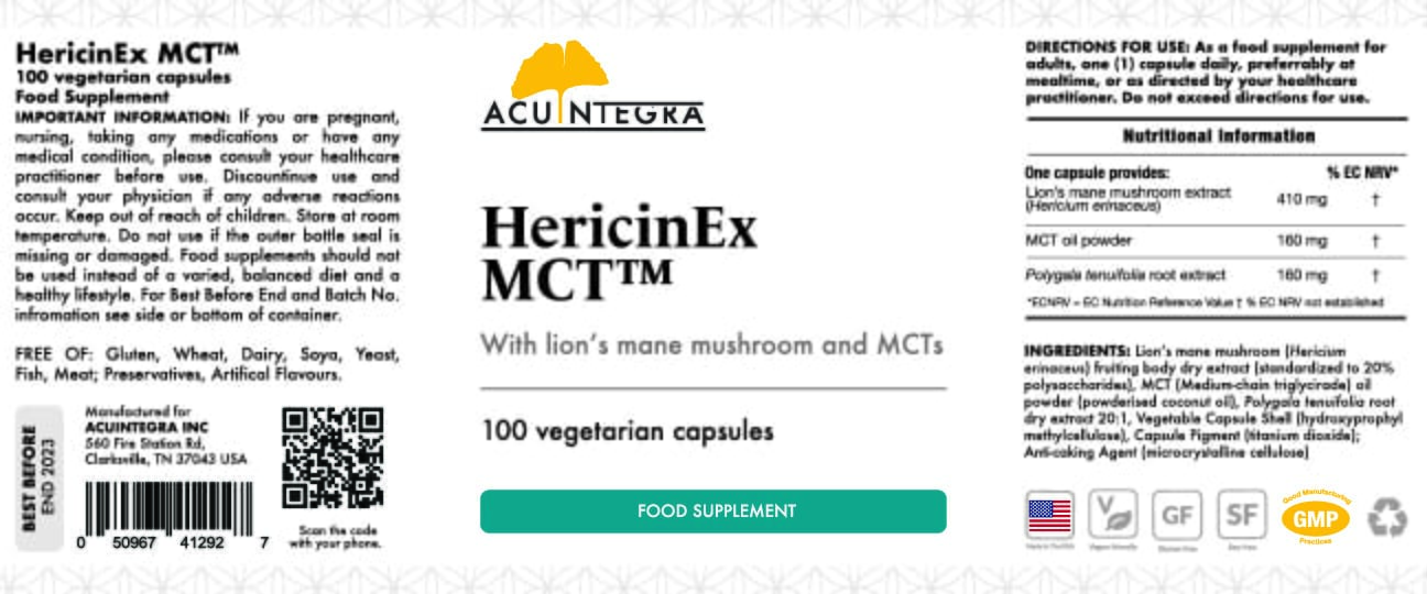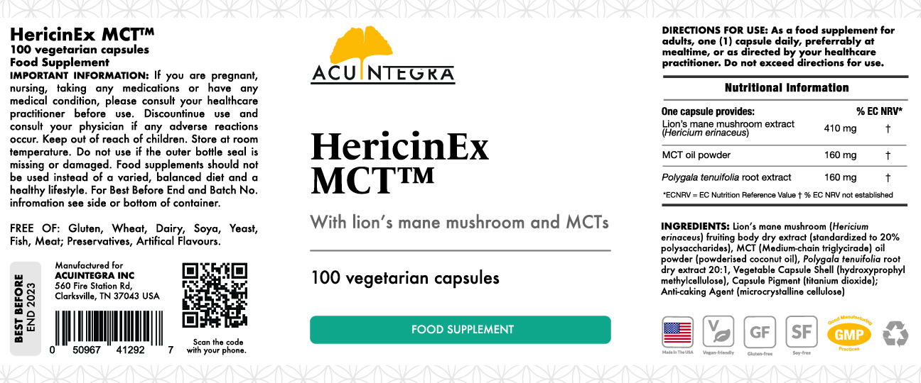 Lionʼs mane mushroom (Hericium erinaceus) fruiting body dry extract (standardized to 20% polysaccharides), MCT (Medium-chain triglycirade) oil powder (powderised coconut oil), Polygala tenuifolia root dry extract 20:1; vegetable capsule shell (hydroxyprophyl methylcellulose), capsule pigment (titanium dioxide); anti-caking agent (microcrystalline cellulose)