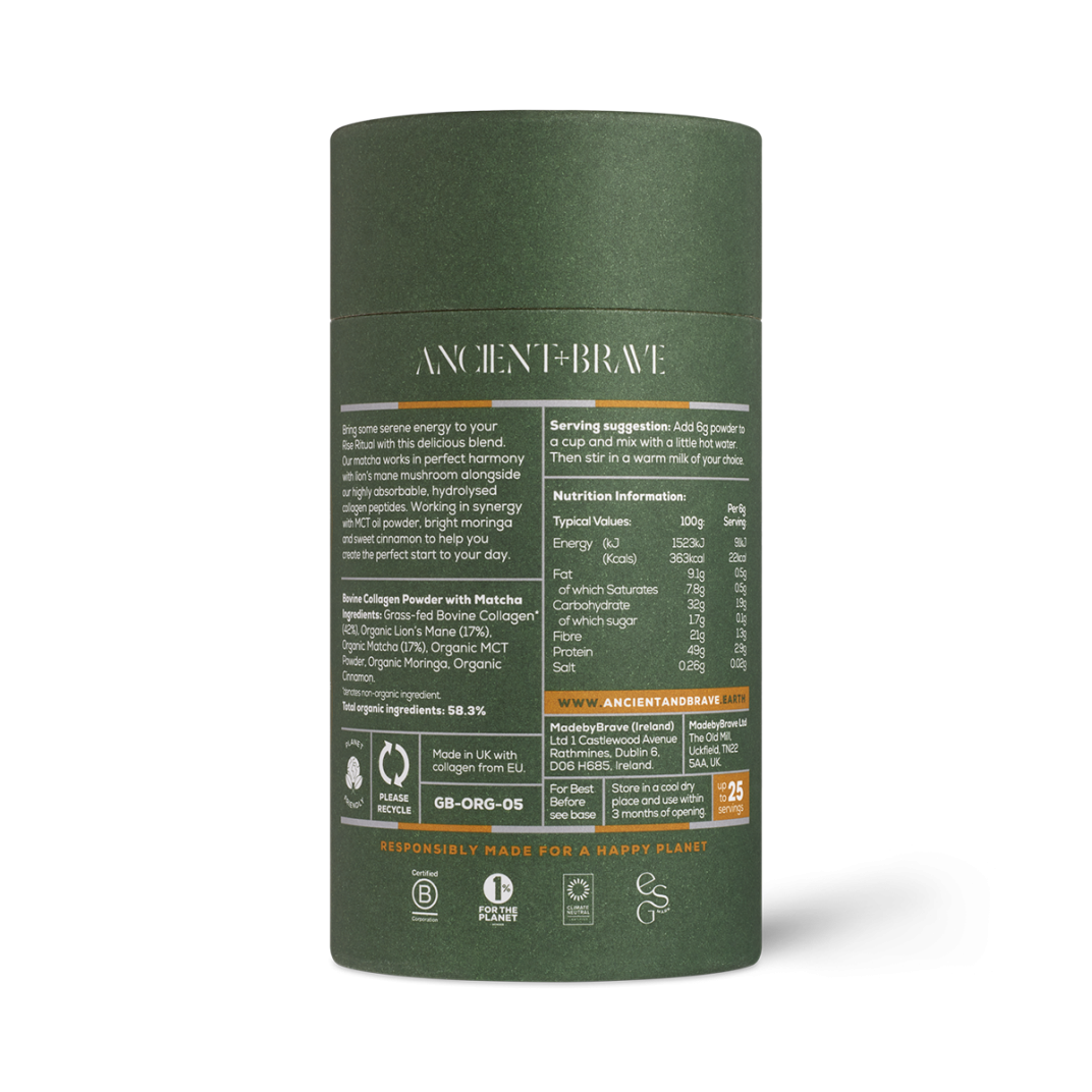 The perfect harmony of organic matcha paired with Ancient and Brave's signature True Collagen peptides and pure organic Lion’s Mane mushroom to dial in a clear mind and nourish your skin from within.