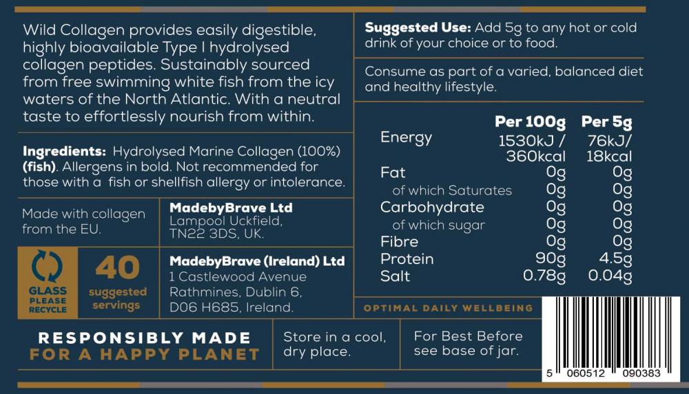 Wild Collagen provides easily digestible, highly bioavailable Type I hydrolysed collagen peptides. Sustainably sourced from free swimming white fish from the icy waters of the North Atlantic. With a neutral taste, it dissolves easily into hot or cold drinks, and is perfect to sprinkle on food.