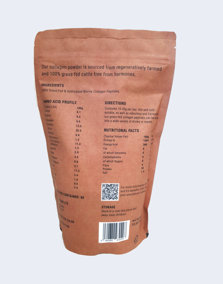 Being a major component of the human body, collagen gives structure to tendons, ligaments, bones, skin, hair, nails and the gut lining. This powder is a combination of type 1 & 3 collagen sourced from 100% grass-fed and finished cattle, free from hormones, antibiotics or exposure to chemicals.