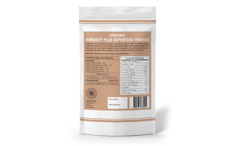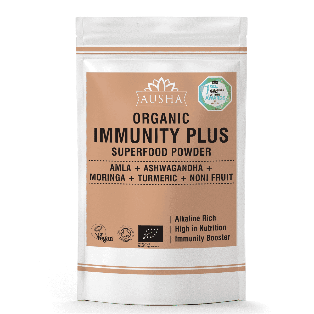 Organic Immunity Plus Superfood Powder is an all in one superfood powder that gives the combined health benefits of organic amla, ashwagandha, moringa, turmeric and noni fruit in a tablespoon size serving. Certified Organic by Soil Association in the UK. Gold Award "Wellness From Within Awards 2024"