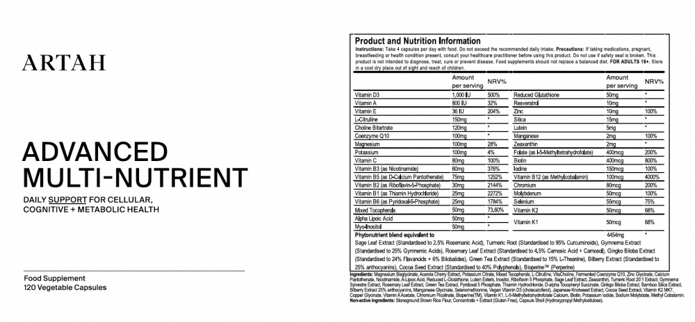 Artah's Advanced Multi-Nutrient is packed with over 40 essential vitamins, minerals, plants and herbs, delivering a full spectrum of targeted phytonutrients and polyphenols to supercharge your health. With specialised nutrients for brain health, cellular health, metabolism and energy.