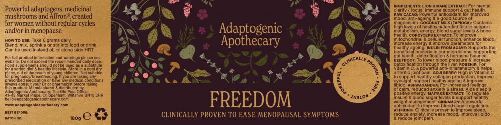 Adaptogenic natural support for women who don’t have regular cycles anymore and, or are in menopause. Freedom can be taken instead of or alongside HRT and contains adaptogens, mushrooms and Affron® to support the hormones.