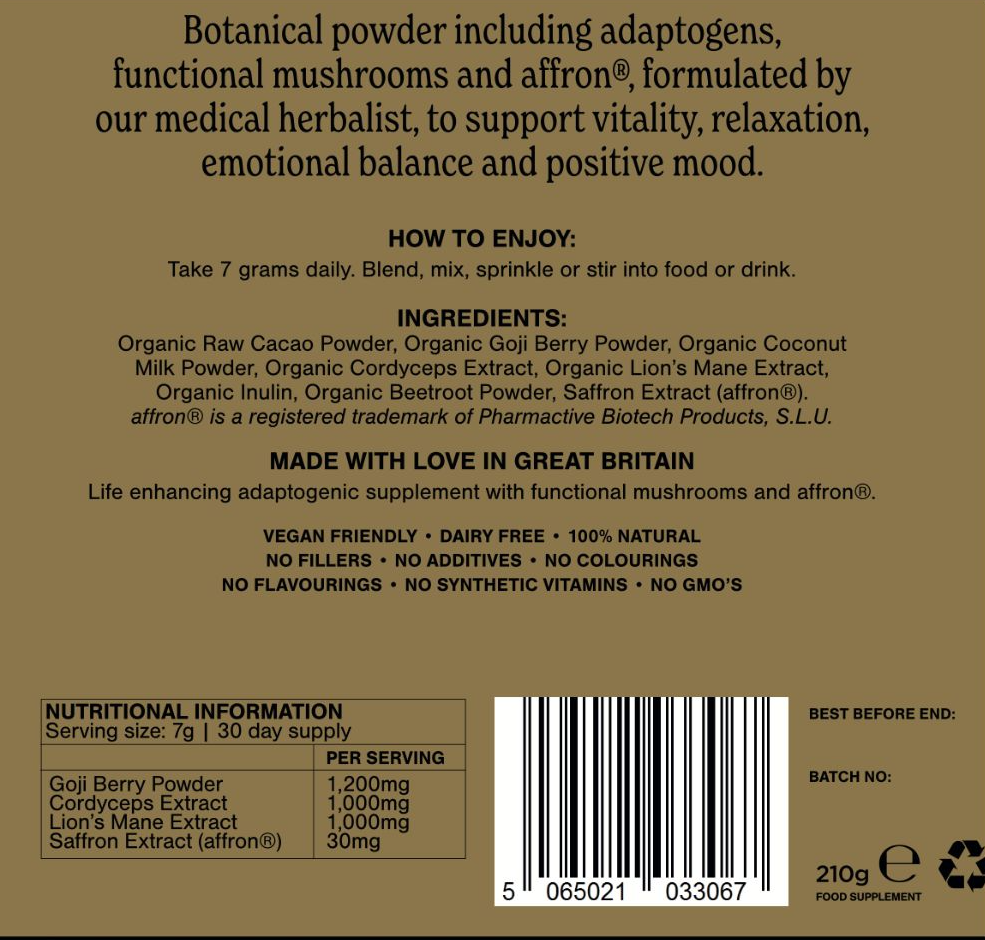 Health and vitality supplement for men, supports energy, athletic, physical and mental performance. Made from adaptogens, mushrooms and Affron® which supports energy, libido, mood, mental focus and hormonal health.