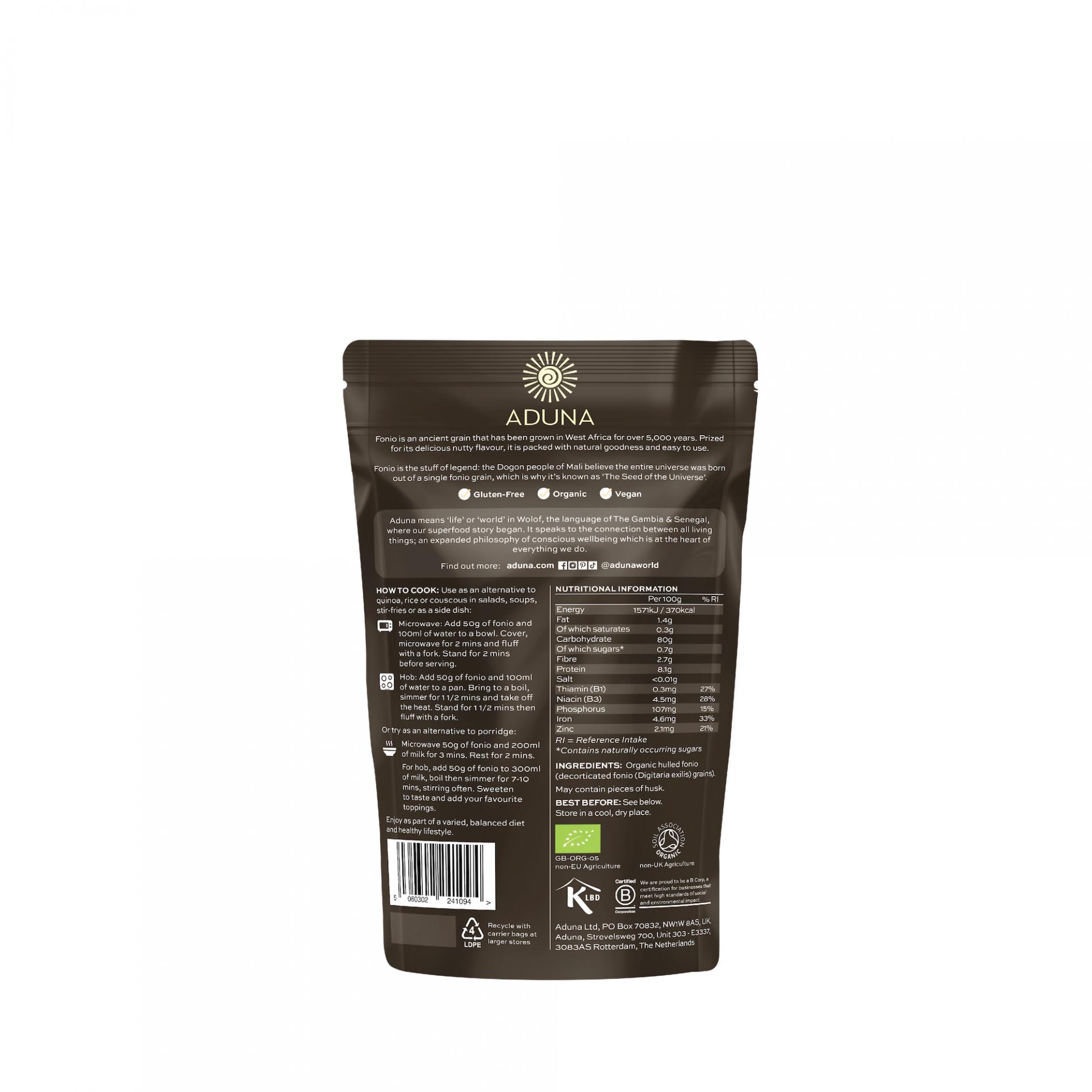 Discover Aduna Fonio. Organic and prewashed Fonio grain harvested in Southern Mali. Rich in iron, amino acids and a source of zinc, vitamins B1 & B3 and phosphorus, with low GI. A great alternative to rice, quinoa & couscous as it has a delicious nutty flavour and easy to use.