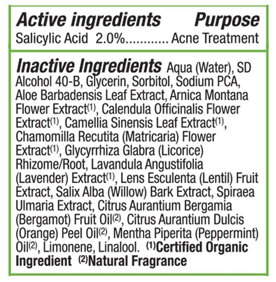 Active Ingredients: Salicylic Acid 2.0 % Inactive Ingredients: Aqua (Water), SD Alcohol 40-B, Glycerin, Sorbitol, Sodium PCA, Aloe Barbadensis Leaf Extract, Arnica Montana Flower Extract (1), Calendula Officinalis Flower Extract (1), Camellia Sinensis Leaf Extract (1), Chamomilla Recutita (Matricaria) Flower Extract (1), Glycyrrhiza Glabra (Licorice) Rhizome/Root, Lavandula Angustifolia (Lavender) Extract (1), Lens Esculenta (Lentil) Fruit Extract, Salix Alba (Willow) Bark Extract, Spiraea Ulmaria Extract, Citrus Aurantium Bergamia (Bergamot) Fruit Oil (2), Citrus Aurantium Dulcis (Orange) Peel Oil (2), Mentha Piperita (Peppermint) Oil (2), Limonene, Linalool
