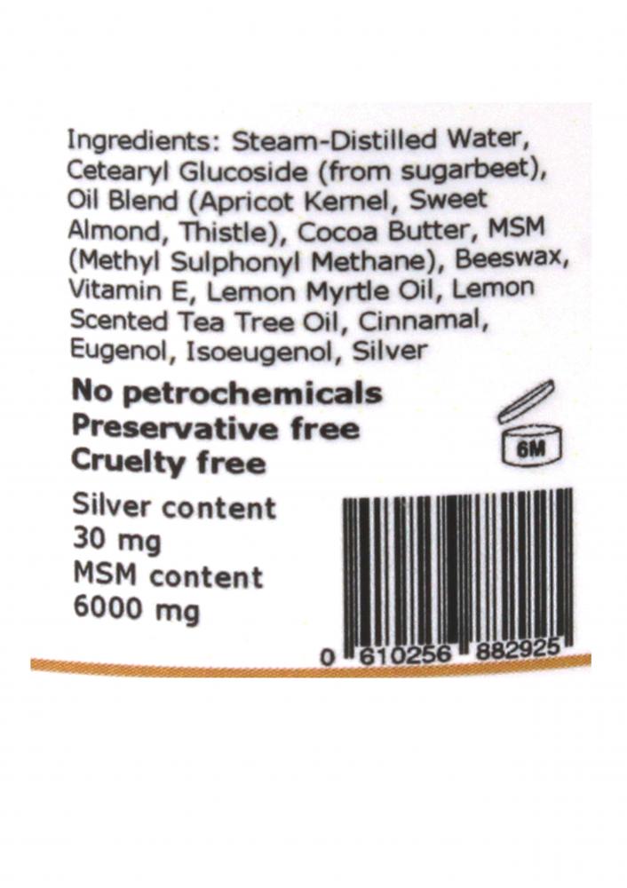 Steam-Distilled Water, Cetearyl Glucoside (from Sugar Beet), Oil Blend (Apricot Kernel, Sweet Almond, Thistle), Cocoa Butter, MSM (Methyl Sulphonyl Methane), Beeswax, Vitamin E, Lemon Myrtle Oil, Lemon Scented Tea Tree Oil, Cinnamal, Eugenol, Isoeugenol, Silver.
