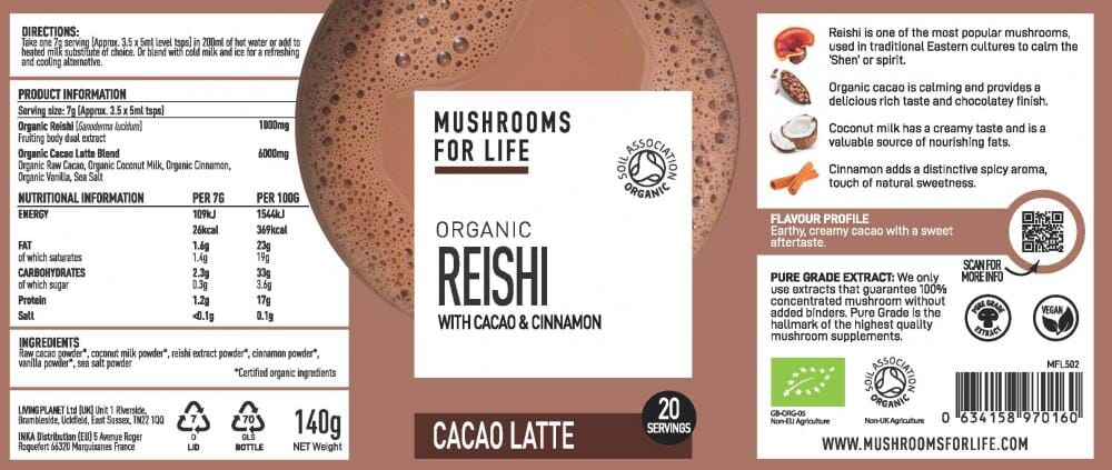 Reishi, known as the 'Mushroom of Immortality,' is prized for its spiritual potency. Mushrooms For Life Reishi Cacao Latte blends Reishi with cacao and creamy coconut for a rich, soul-nourishing cacao warmer.