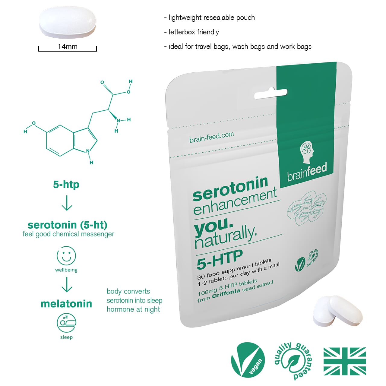 5-HTP is the building block to your happy, chemical messenger; serotonin (5-HT) ideal for people who live a stressful lifestyle, work long hours, and struggle sleeping.