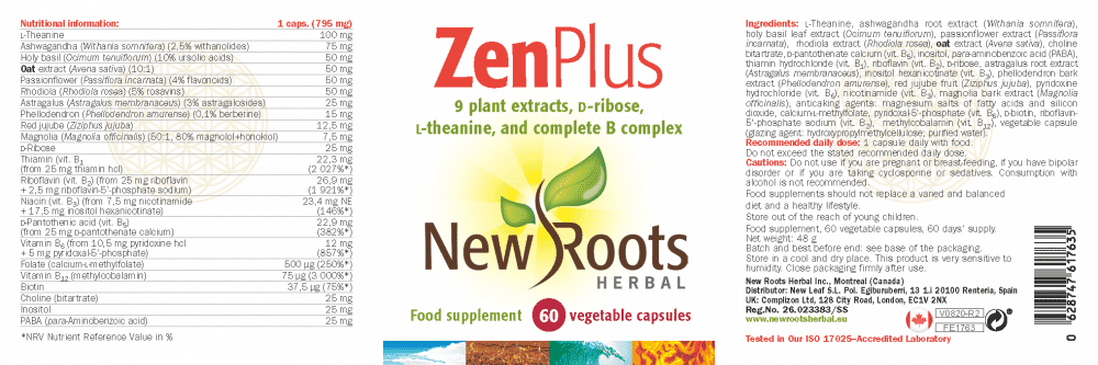 L-Theanine, ashwagandha root extract (Withania somnifera), holy basil leaf extract (Ocimum tenuiflorum), passionflower extract (Passiflora incarnata), rhodiola extract (Rhodiola rosea), oat extract (Avena sativa), choline bitartrate, D-pantothenate calcium (vit. B5), inositol, para-aminobenzoic acid (PABA), thiamin hydrochloride (vit. B1), riboflavin (vit. B2), pyridoxine hydrochloride (vit. B6), D-ribose, astragalus root extract (Astragalus membranaceus), inositol hexanicotinate (vit. B3), phellodendron bark extract (Phellodendron amurense), red jujube fruit (Ziziphus jujuba), nicotinamide (vit. B3), magnolia bark extract (Magnolia officinalis), anticaking agents: magnesium salts of fatty acids and silicon dioxide, calcium L-methylfolate, D-biotin, riboflavin-5' phosphate sodium (vit. B2), pyridoxal-5' phosphate (vit. B6), methylcobalamin (vit. B12), vegetable capsule (glazing agent: hydroxypropylmethylcellulose; purified water).
