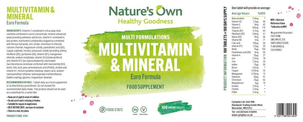 Vitamin C combined in citrus pulp; beta carotene combined in carrot concentrate; mineral-enhanced yeast providing selenium and boron; vitamin E combined in pea protein; inactivated Lactobacillus bulgaricus combined with ferrous fumarate, zinc citrate, chromium III chloride, calcium chloride, magnesium citrate, pantothenic acid (B5), copper sulphate, inositol, potassium iodide (providing iodine), riboflavin (B2), pyridoxine (B6), thiamin (B1), manganese chloride, sodium molybdate, vitamin D3 and vitamin B12; inactivated Saccharomyces cerevisiae combined with niacinamide (B3), biotin, folic acid, para-aminobenzoic acid (PABA), choline and vitamin K1, microcrystalline cellulose, stearic acid, sodium carboxymethyl cellulose, glycerin, magnesium stearate
