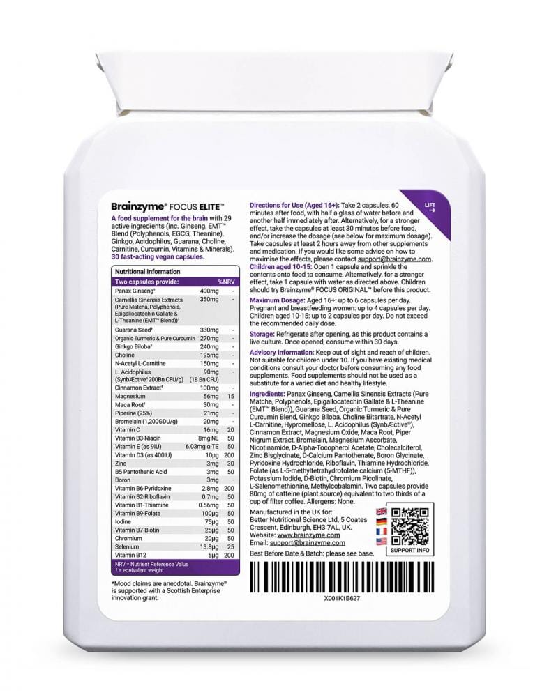 Brainzyme® FOCUS ELITE™ is a plant-powered focus supplement containing scientifically proven ingredients that provide brain nutrition to support a sustained stress-free focus and mental energy boost with positive mood, memory and brain health support. It helps you Think Clearer, Get More Done™.