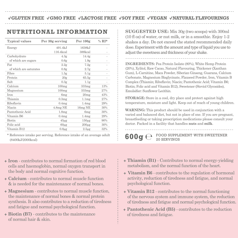 Pea Protein Isolate, Hemp Protein Isolate, Magnesium Citrate, Magnesium Oxide, Calcium Carbonate, Ferrous Fumarate, Folic Acid, Niacin, Biotin, Pantothenic Acid (Vitamin B5), Cyanocobalamin (Vitamin B12), Pyridoxine Hydrochloride (Vitamin B6), Riboflavin (Vitamin B2), Thiamine Hydrochlordie (Vitamin B1), L-Carnitine, Maca Powder, Siberian Ginseng, Caffeine Anhydrous, Guarana Seed, Plain Caramel, Flax Seed Powder, Fat-Reduced Cocoa Powder, Natural Flavouring, Himalayan Fine Pink Salt, Steviol Glycosides, Thickener (Xanthan Gum), Xylitol, Sunflower Lecithin