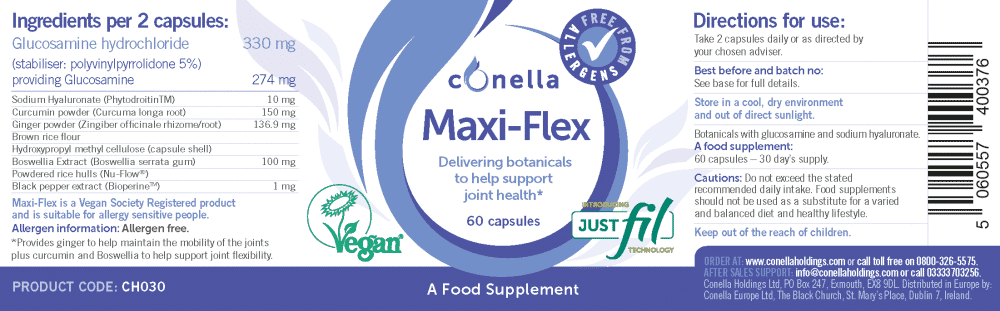 Botanicals with glucosamine and sodium hyaluronate. Provides ginger to help maintain the mobility of the joints plus curcumin and boswellia to help support joint flexibility.