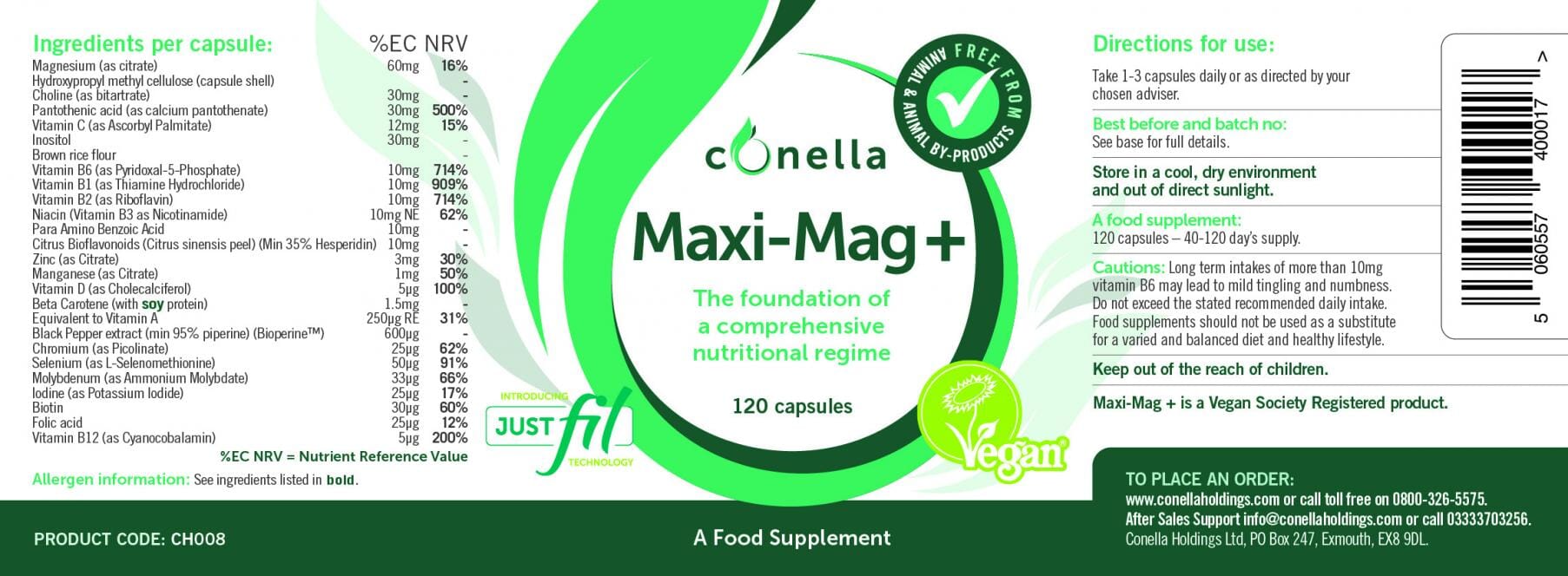 Magnesium citrate, hydroxypropyl methyl cellulose capsule shell, choline bitartrate, calcium pantothenate, ascorbyl Palmitate, inositol, brown rice flour, pyridoxal-5-phosphate, thiamine hydrochloride, riboflavin, nicotinamide, para amino benzoic acid, citrus bioflavonoids, zinc citrate, manganese citrate, cholecalciferol, beta carotene (with soy protein), black pepper extract (Bioperine™), chromium picolinate, L-selenomethionine, ammonium molybdate, potassium iodide, biotin, folic acid, cyanocobalamin.