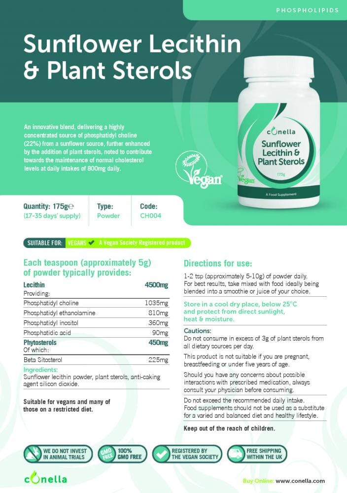 A concentrated phospholipid derived from sunflower source. Phosphatidyl choline (22%) combined with plant sterols containing the plant sterol “beta-sitosterol”. Plant sterols contribute to the maintenance of normal cholesterol levels at daily intakes of at least 800mg.