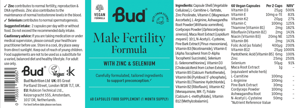 Specially formulated fertility supplement for men. Bud’s innovative formulas contain vitamins, minerals and adaptogens, proven to support vital aspects of reproductive health, supporting sperm quality and function as well as libido. Includes maca, zinc, selenium and L-carnitine.