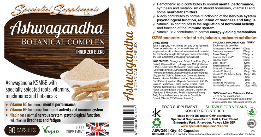 Stoneground Brown Rice Flour (Oryza Sativa), Capsule Shell: Hydroxypropyl Methylcellulose (HPMC), Cordyceps Mushroom Fruiting Body Extract (Cordyceps sinesis), Ashwagandha Extract KSM66 (Withania somnifera), Deglycyrhized Liquorice Extract (Glycyrrhiza Glabra), Schisandra Chinensis Berries Powder, Vitamin B3 (Nicotinamide), Peruvian Maca Root Extract (Lepidium Meyenii), Pantothenic Acid (D-Calcium Panthonate), Black Pepper Extract (Piper nigrum), Turmeric Root Powder (Curcuma Longa), Panax Ginseng Extract (Panax Ginseng), Vitamin B6 (Pyridoxal 5 Phosphate), Reishi Mushroom Fruiting Body Extract (Ganoderma Lucidum), Gotu Kola Extract, Vitamin B12 (Cyanocobalamin)