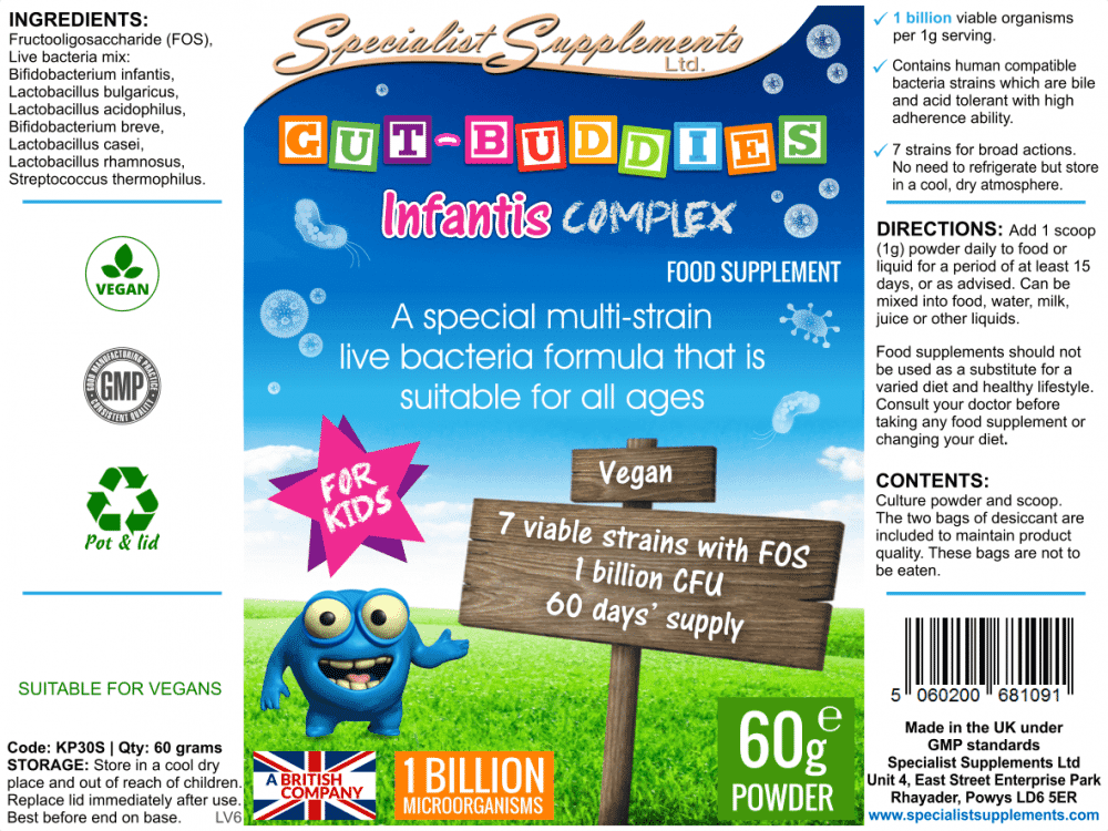 A live culture and FOS powder for children of all ages - 1 billion CFU. A combination of viable organisms from 7 strains: Lactobacillus casei, Lactobacillus rhamnosus, Streptococcus thermophilus, Bifidobacterium breve, Lactobacillus acidophilus, Lactobacillus bulgaricus and Bifidobacterium infantis.