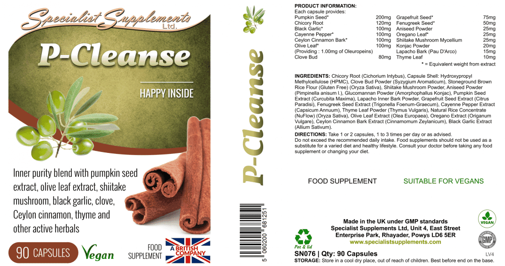 Chicory Root (Cichorium Intybus), Capsule Shell: Hydroxypropyl Methylcellulose (HPMC), Clove Bud Powder (Syzygium Aromaticum), Stoneground Brown Rice Flour (Gluten Free) (Oryza Sativa), Shiitake Mushroom Powder, Aniseed Powder (Pimpinella anisum l.), Glucomannan Powder (Amorphophallus Konjac), Pumpkin Seed Extract (Curcubita Maxima), Lapacho Inner Bark Powder, Grapefruit Seed Extract (Citrus Paradisi), Fenugreek Seed Extract (Trigonella Foenum-Graecum), Cayenne Pepper Extract (Capsicum Annuum), Thyme Leaf Powder (Thymus Vulgaris), Natural Rice Concentrate (NuFlow) (Oryza Sativa), Olive Leaf Extract (Olea Europaea), Oregano Extract (Origanum Vulgare), Ceylon Cinnamon Bark Extract (Cinnamomum Zeylanicum), Black Garlic Extract (Allium Sativum)