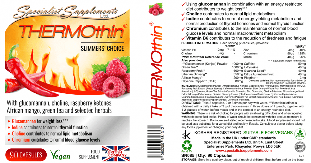 A herbal weight loss formula, with glucomannan (konjac), green tea, Siberian ginseng, African mango, citrus aurantium, cayenne pepper (chilli), raspberry fruit, caffeine, L-Tyrosine, guarana seed, piperine, vitamin B6, choline, zinc, chromium and iodine. With EFSA approved claims.