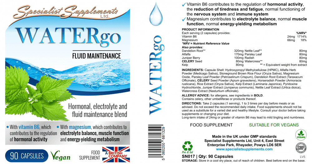An electrolyte, hormone and fluid maintenance blend of herbals, vitamins and minerals: dandelion root, alfalfa, juniper berry, celery seed, kelp, nettle leaf, parsley leaf, radish, watercress, magnesium and vitamin B6. Contributes to the regulation of hormonal activity (EFSA approved health claim).