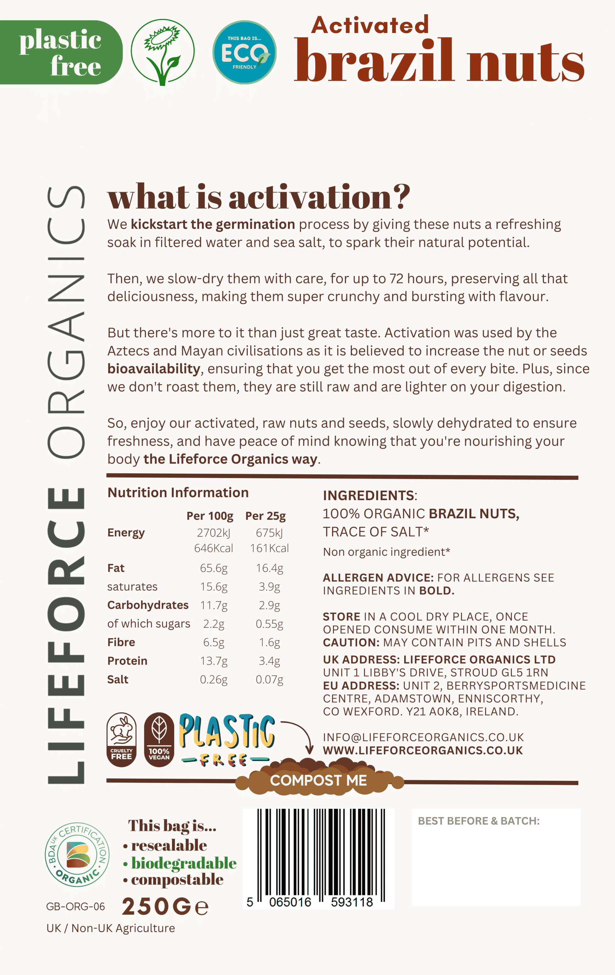 Organic Brazil nuts, rinsed and then soaked for 12 hours to start germination and 'activate' them, this allows access to their full nutrient profile. Then gently dehydrated below 43°C to preserve their raw qualities. Activated Brazils are also cleaner, crunchier and have improved flavour.