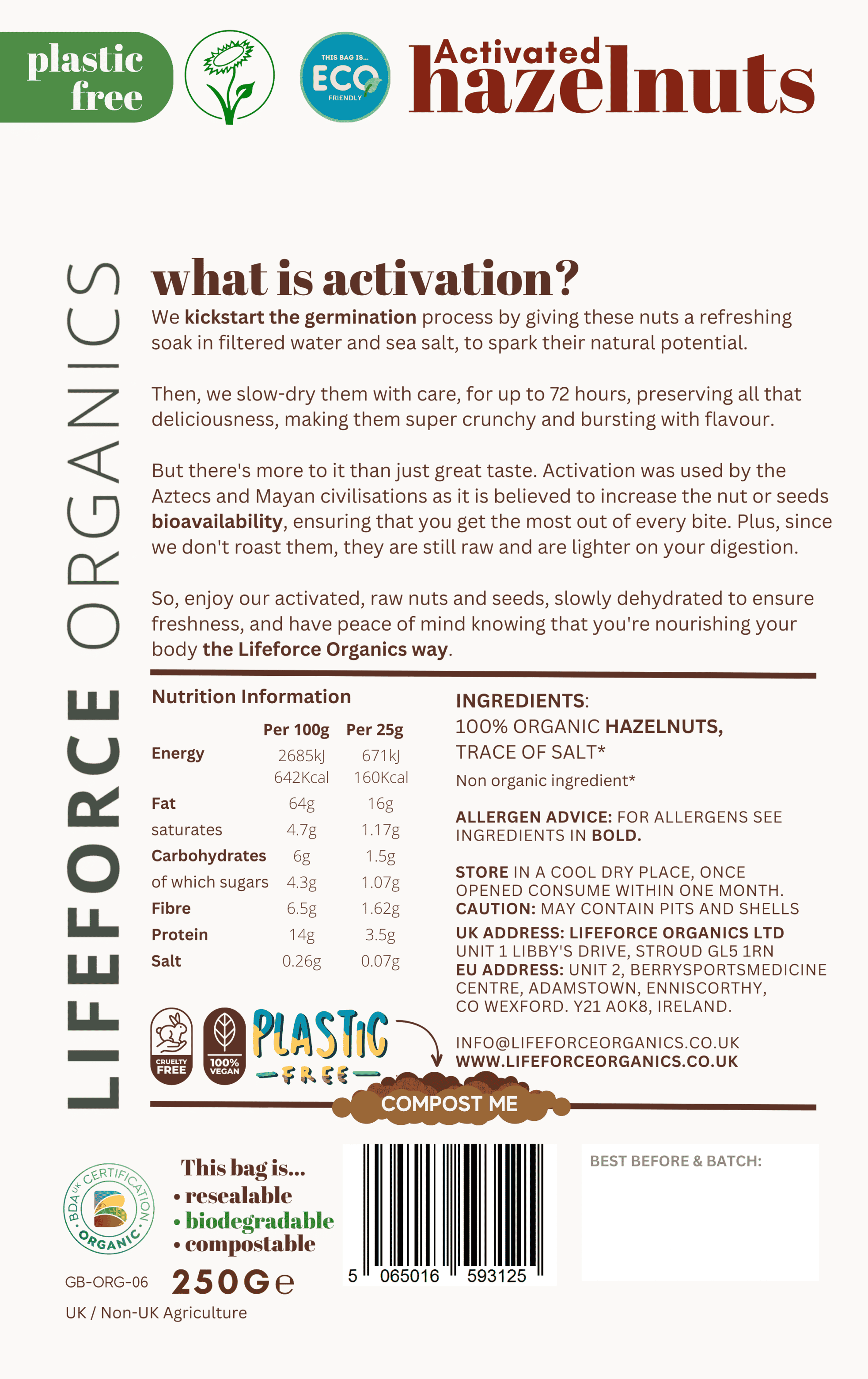Organic hazelnuts, rinsed and then soaked for 12 hours to start germination and 'activate' them, this allows access to their full nutrient profile. Then gently dehydrated below 43°C to preserve their raw qualities. Activated hazelnuts nuts are cleaner, crunchier and have improved flavour.