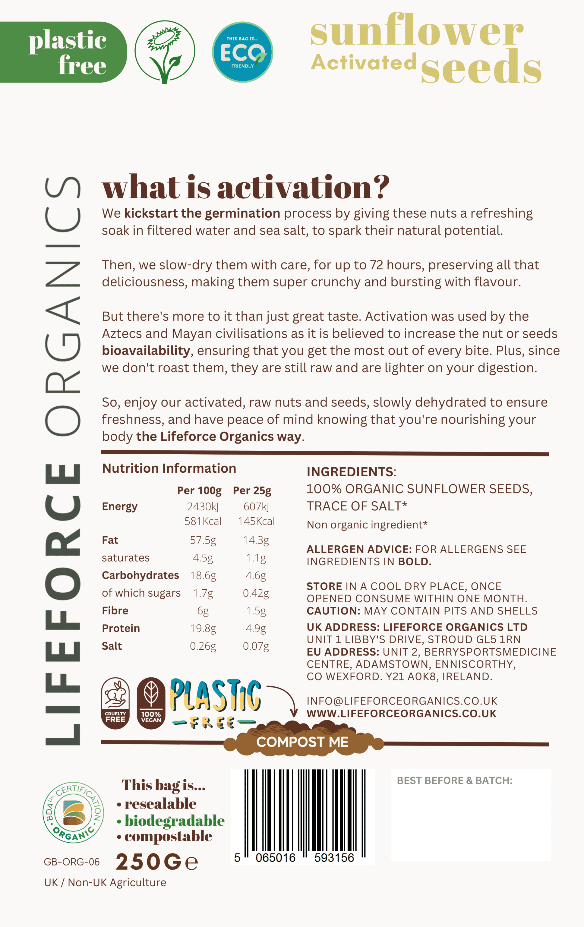 Lifeforce Organics strive to be environmentally friendly wherever possible and ask that you contribute to sustainability by composting the bag, helping reduce waste and our environmental impact.