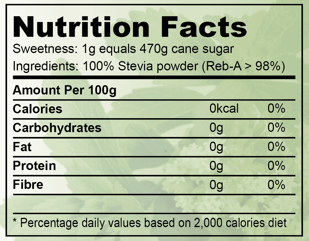 NKD Living’s non-GMO 100% pure stevia powder (Rebaudioside-A extract> 98%) is without fillers or additives and has a sweetness of 470 times that of regular sugar with zero calories.