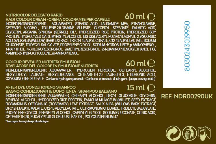 AQUA/WATER, STEARIC ACID, LAURAMIDE MEA, ETHANOLAMINE, CETEARYL ALCOHOL, GLYCERYL STEARATE, PALMITIC ACID, GLYCERIN, ARGANIA SPINOSA (KERNEL) OIL°, HYDROLYZED RICE PROTEIN, HYDROLYZED SOY PROTEIN, HYDROLYZED OATS, MYRISTYL ALCOHOL, BIS-DIGLYCERYL POLYACYLADIPATE-2, ASCORBIC ACID, SALIX ALBA (WILLOW) BARK EXTRACT, TRI-C14-15 ALKYL CITRATE, C12-13 ALKYL LACTATE, SODIUM GLUCONATE, TRIDECYL SALICYLATE, PROPYLENE GLYCOL, SODIUM HYDROSULFITE, p-AMINOPHENOL, 1-NAPHTHOL, 4-CHLORORESORCINOL, 2-METHYLRESORCINOL, 2,4-DIAMINOPHENOXYETHANOL HCl, 4-AMINO-2-HYDROXYTOLUENE, TOLUENE-2,5-DIAMINE SULFATE, 1-HYDROXYETHYL 4,5-DIAMINO PYRAZOLE SULFATE, PHENYL METHYL PYRAZOLONE, m-AMINOPHENOL