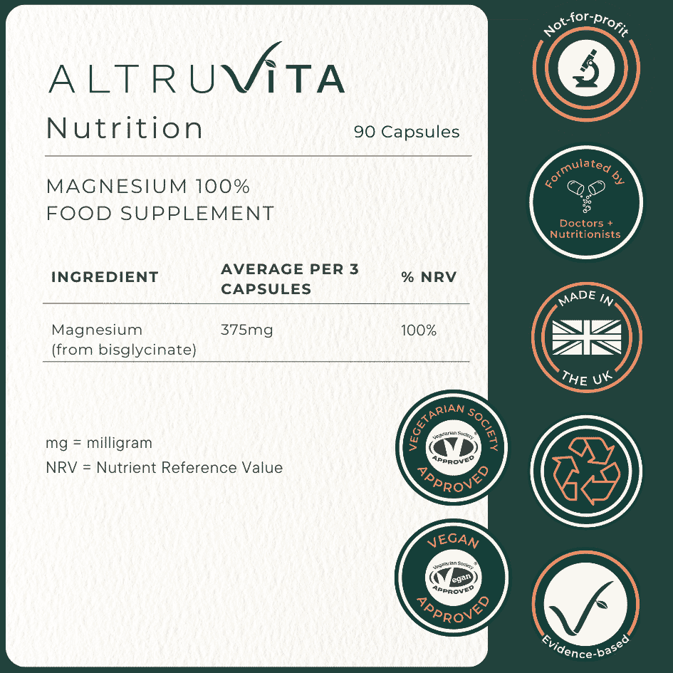 AltruVita Magnesium 100% is from highly absorbable magnesium bisglycinate that easily absorbs in the small intestine. Provides 100% of daily needs. Supports normal psychological function, functioning of the nervous system, muscle function, normal protein synthesis, and maintains bones and teeth.