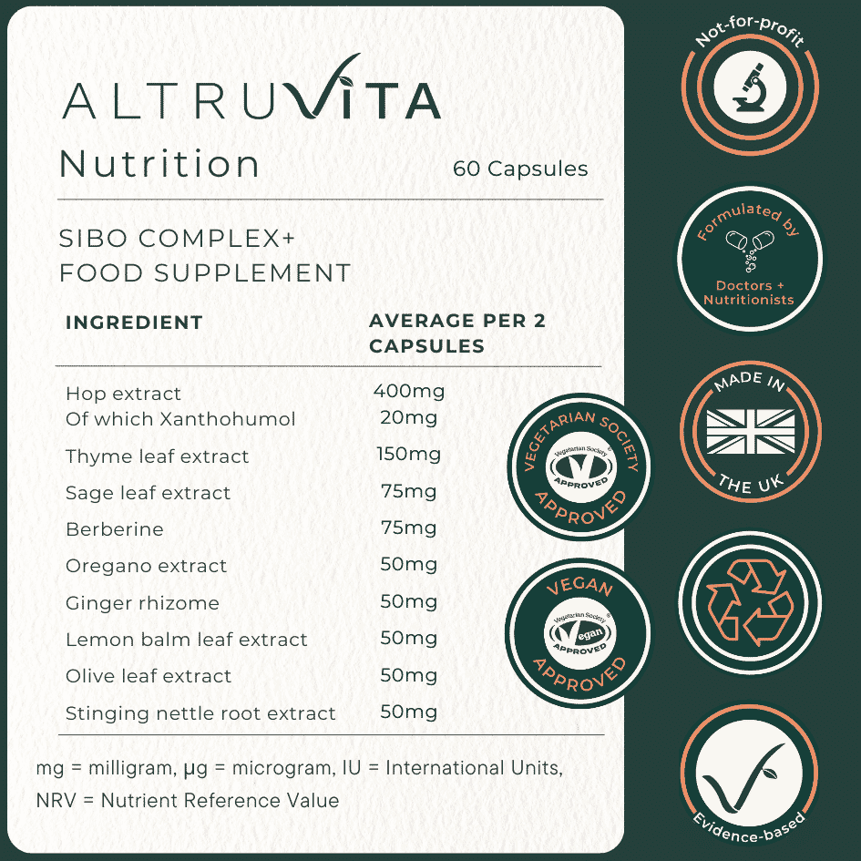 AltruVita SIBO Complex+ is a natural and clean multi-herbal formulation featuring nine herbs, including berberine and oregano, designed to target small intestinal microbial imbalance and related symptoms.