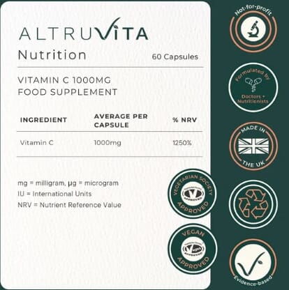 AltruVita Vitamin C 1000mg is a high absorbing vitamin C supplement from L-ascorbic acid which is designed to support the immune system, protect cells from oxidative stress, reduce tiredness and fatigue and support collagen formation.
