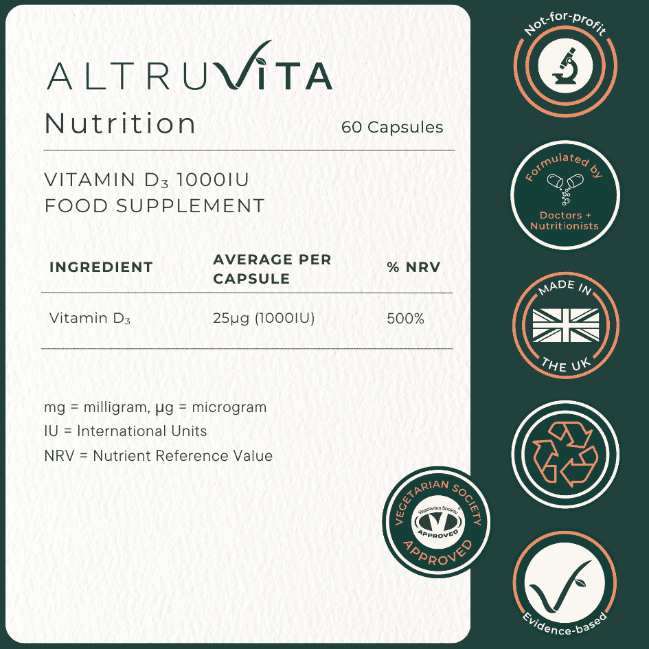 AltruVita Vitamin D3 1000IU is a clean formulation designed to support normal immune system function, the process of cell division, and to maintain bone, tooth and muscle health.