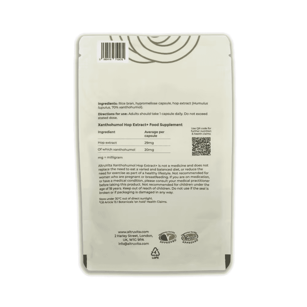 AltruVita’s Xanthohumol Hop Extract+ is a high strength clean capsule containing 70% xanthohumol which is a bioactive flavonoid designed to target inflammation and oxidation related problems as well as relaxation and sleep.