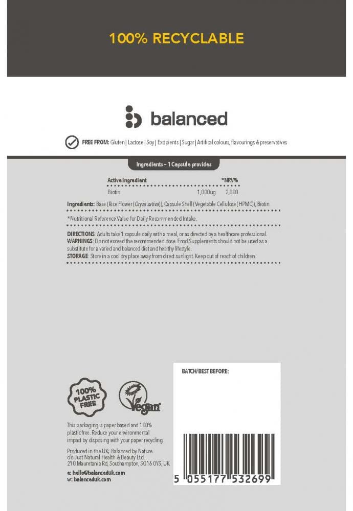 Balanced Biotin provides 1000ug of high-quality pure biotin. Also sometimes referred to as Vitamin B7, B8, or H, it's a water-soluble vitamin and like all other B vitamins cannot be stored by the body. It must therefore be a standard part of the diet to avoid any deficiency. In a handy refill pouch.
