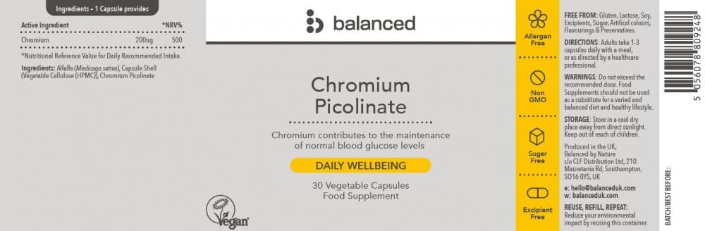 Chromium is an essential trace mineral that helps the body regulate normal blood glucose levels as well as blood cholesterol levels and many other benefits. In picolinate form, Balanced Chromium is highly absorbent and is vegan and free from excipients, soy, GMO, gluten, lactose and sugar.