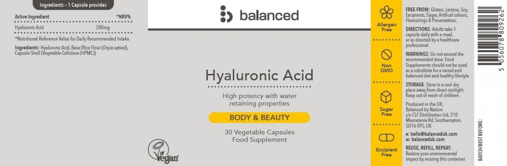 Hyaluronic Acid is a natural protein that occurs naturally in the body and is widely distributed throughout connective tissues, synovial fluids, the skin, and the eyes. This Balanced formula is high potency with water retaining properties, and it's Vegan and free from excipients, GMO and Allergens.