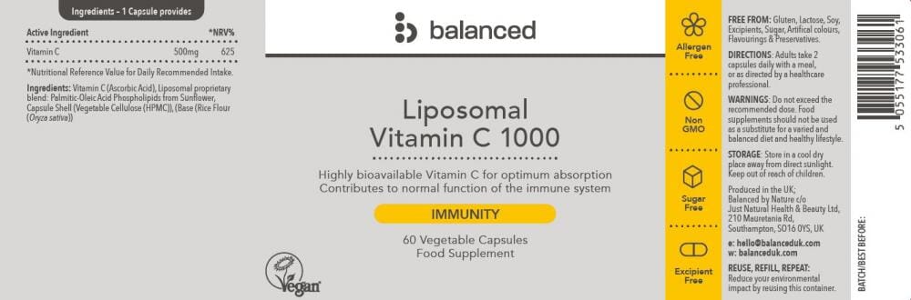 Vitamin C (Ascorbic Acid), Liposomal proprietary blend: Palmitic-Oleic Acid Phospholipids from Sunflower, Capsule Shell (Vegetable Cellulose (HPMC)), (Base (Rice Flour (Oryza sativa))