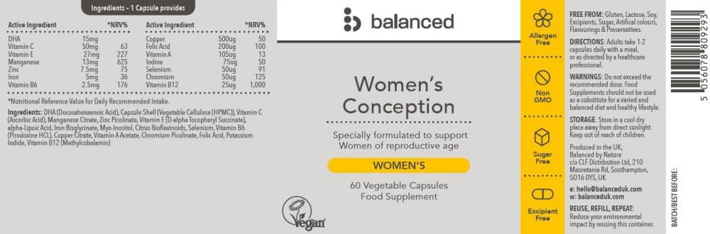 Balanced Women’s Conception has been formulated to support women of reproductive age by providing essential nutrients including Folic Acid, Zinc, and Copper. This Conception formula is also Vegan and free from excipients, allergens, GMO and sugar.