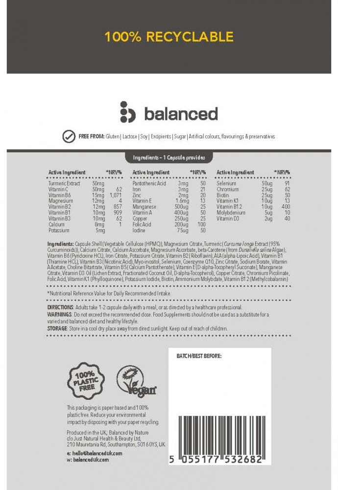 Balanced Women’s Multi 40+ is a multivitamin and mineral complex specifically blended to meet the needs of women aged over 40 containing over 30 minerals and vitamins including a blend of B Vitamins, Vitamin C, chelated minerals, iron and important trace minerals. Vegan, excipient and allergen free.