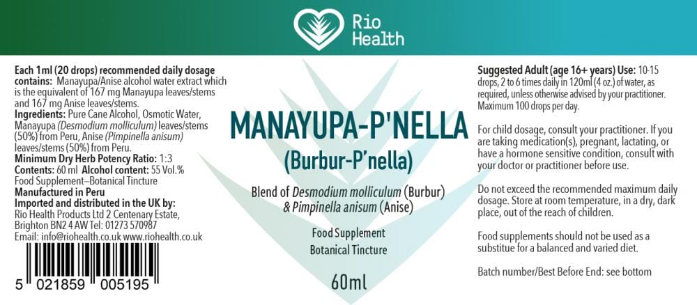 Desmodium molliculum (Manayupa/Burbur) & P'nella/Anise from Peru. Min Dry Herb Potency Ratio 1:3. Calibrated dropper for easy dispensing. Each 1ml (20 drops) rec daily dosage contains Manayupa/Anise alcohol water extract which is equivalent of 167mg Manayupa leaf/stem & 167mg Anise leaf/stem.