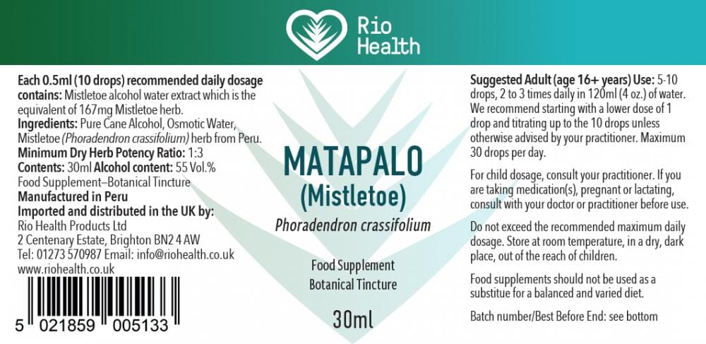 Tincture of Mistletoe (Phoradendron crassifolium) aka Matapalo. Min Dry Herb Potency Ratio 1:3. Each 0.5ml (10 drops) recom daily dosage contains Mistletoe alcohol water extract which is the equivalent of 167mg Mistletoe herb. Calibrated dropper for easy dispensing. Bottle contains approx 600 drops.