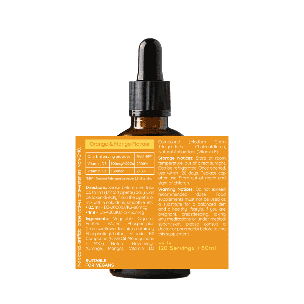 0.5ml delivers 2000IU Vitamin D3 + 80mcg Vitamin K2.