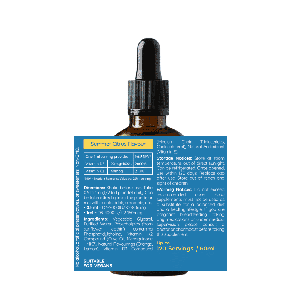 0.5ml delivers 2000IU Vitamin D3 + 80mcg Vitamin K2