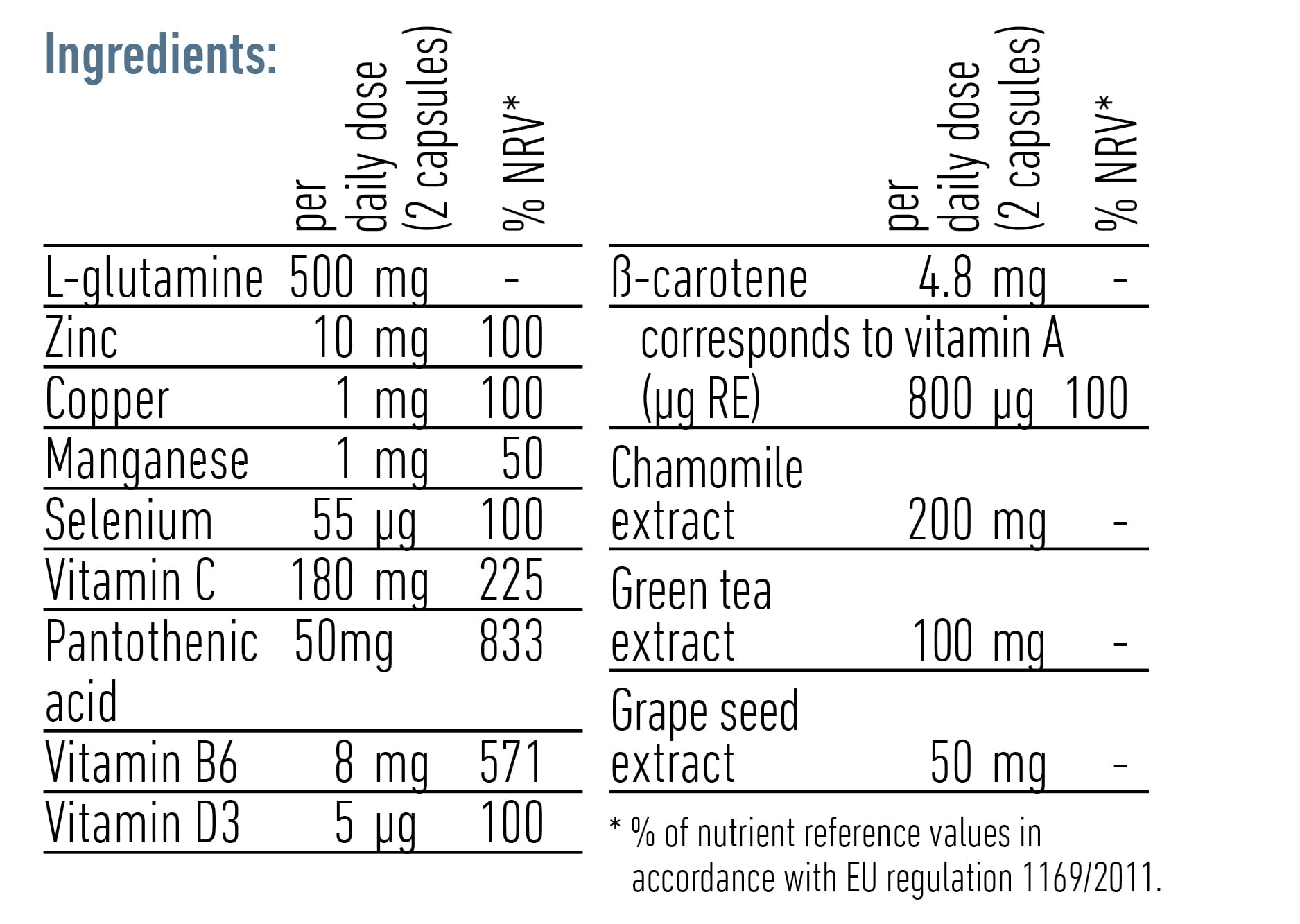 A combination of vitamins and trace elements with the amino acid L-glutamine and selected plant extracts. With provitamin A (beta-carotene). Vitamin A supports the normal functions of the mucosa. The intestinal mucosa has the largest mucosal surface area of the body.