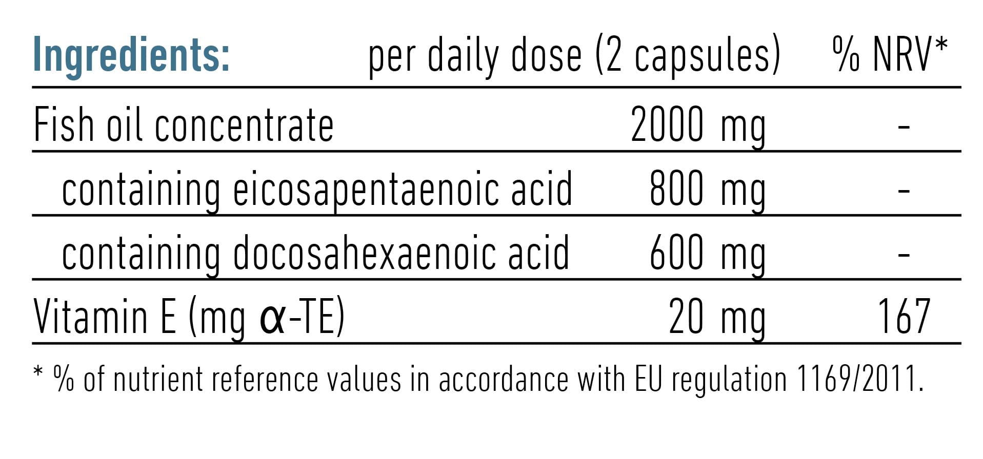 Fish oil concentrate, capsule shell (gelatine from fish, humectant: glycerol), D-alpha-tocopherol, mixed tocopherols.