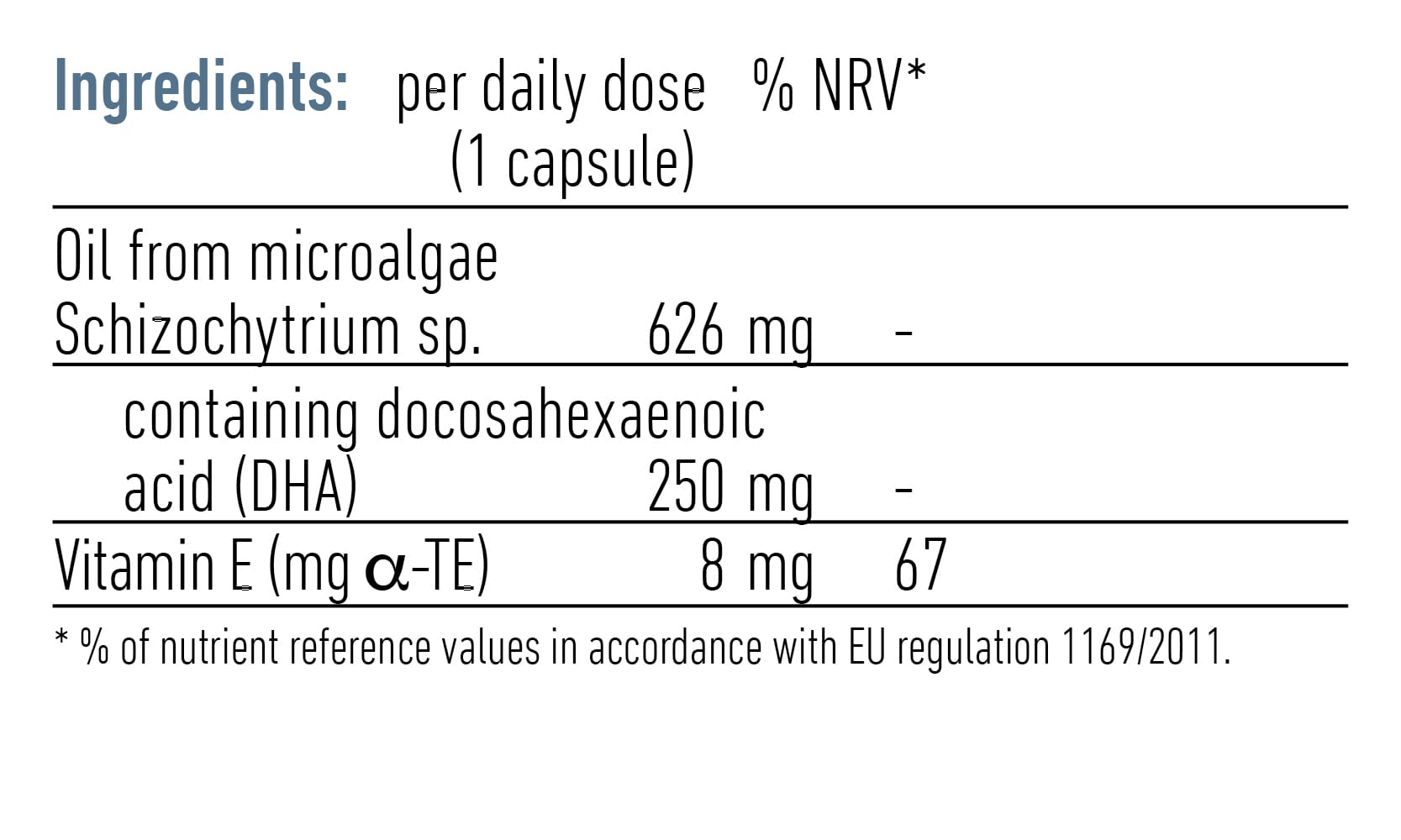 Oil from microalgae Schizochytrium sp., capsule shell (modified starch, humectant: glycerol;